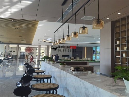 今天分享的是銀川熙玉園售樓部大廳裝修項目實景圖分享。售樓部大廳内的家具選擇極具設計感,如弧形白色沙發,造型流暢且材質,搭配黑色金屬質感的圓形茶幾,形成“黑白灰”經典輕奢配色,既顯時尚又不失穩重。地面採(cǎi)用的是大規格灰色大理石瓷磚,通過高光工藝呈現出強烈的鏡面反射效果,既延伸瞭(le)空間視覺感,又傳遞出高端、精緻的奢華氣質,整體而言,該售樓部以現代輕奢風爲基調,通過材質、家具、藝術裝置的精心搭配,打造出既高端大氣又富有藝術感的空間,既能吸引客戶目光,又能傳遞出項目的品質定位,是現代售樓部設計中“形象展示+體驗感營造”的優質範例。